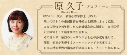 東洋医学の治療家として臨床研究を重ね、日本三大賞の一つである「東久邇宮文化褒賞(皇室から賜る宮賞)」を受賞、そしてこれまで延べ80,000人もの方に指導をされてこられた名誉心理学博士(U.S.A.)である、原久子先生からの情報をもとにお伝えいたします。