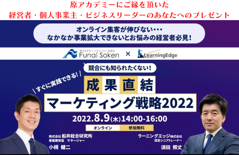 そんなご縁のある、船井総合研究所と、日本で最大級のビジネスセミナーの会社ラーニングエッジ株式会社とのコラボレーション企画です。