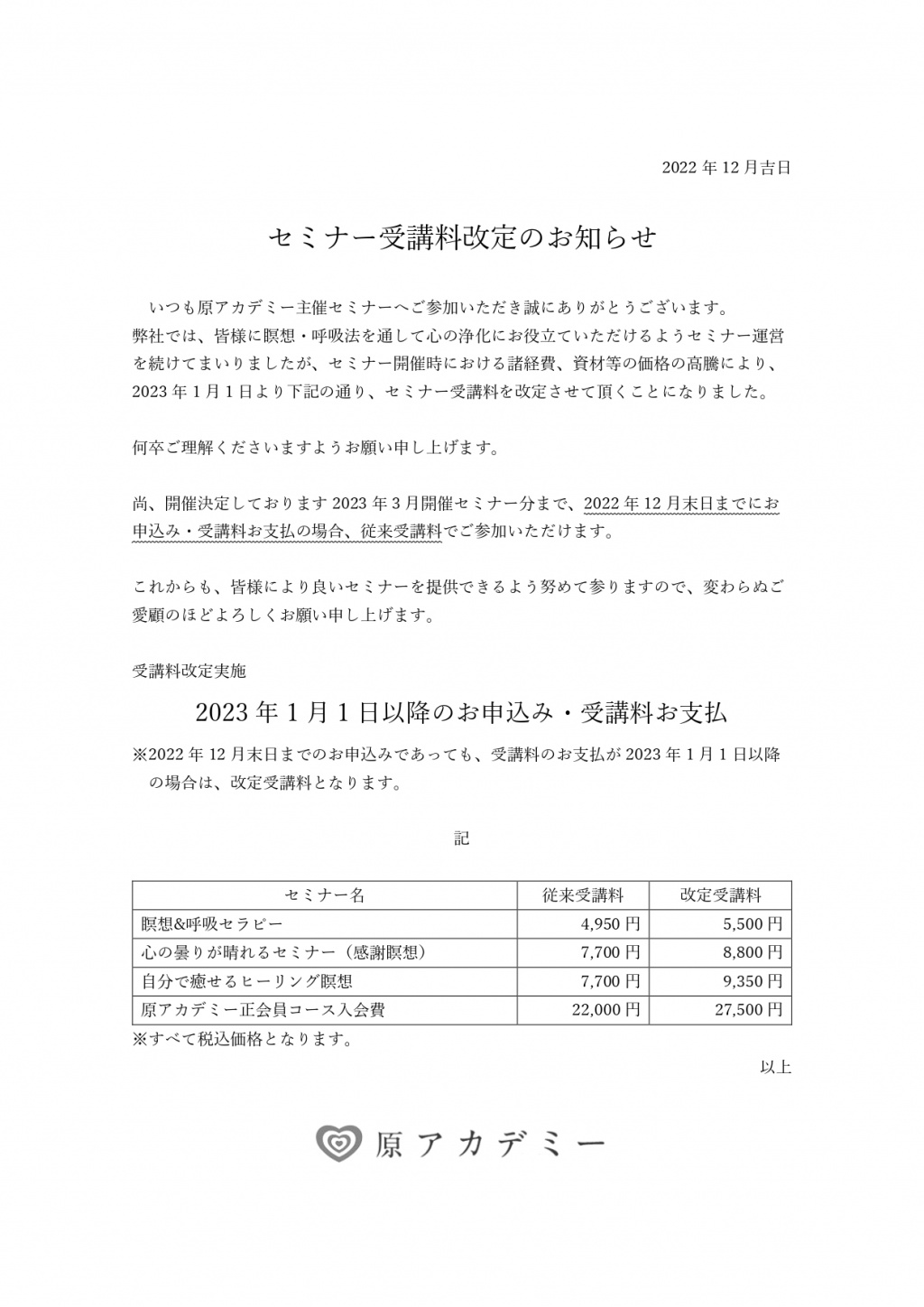 受講料改定のお知らせ